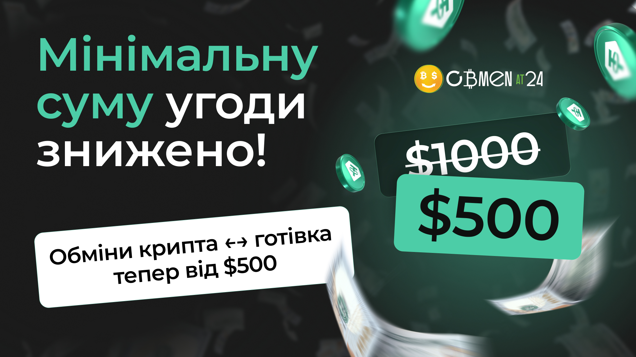 Чудова новина для клієнтів, які купують або продають крипту за готівку — ми знизили мінімальну суму, і тепер операції з обміну криптовалют можна здійснити на суму від 500$, замість 1000$.