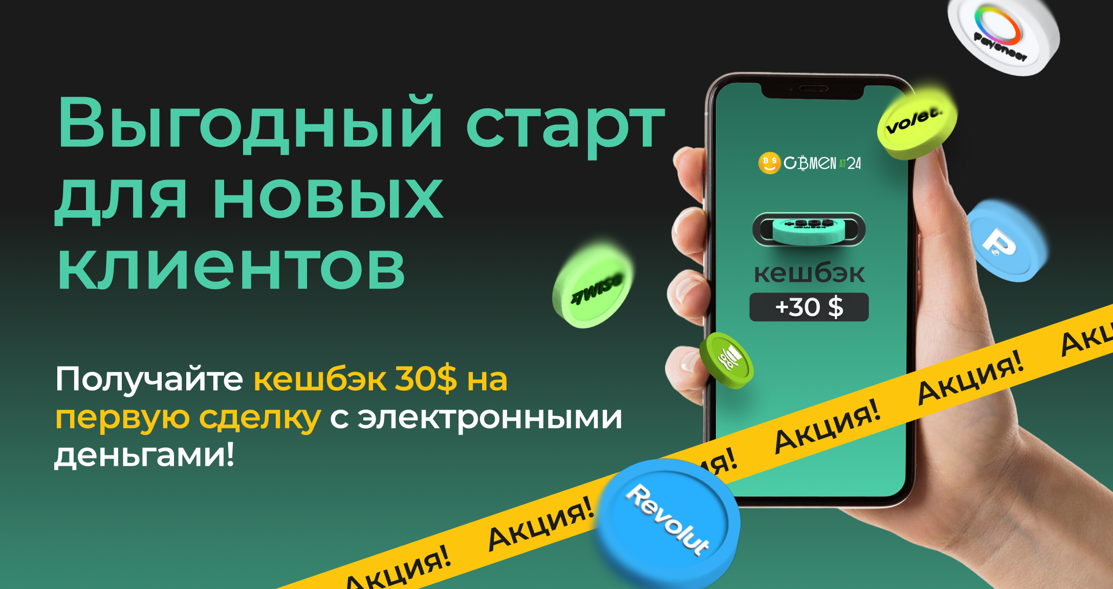 Акция! Дарим кэшбэк 30$ за первую сделку с электронными деньгами